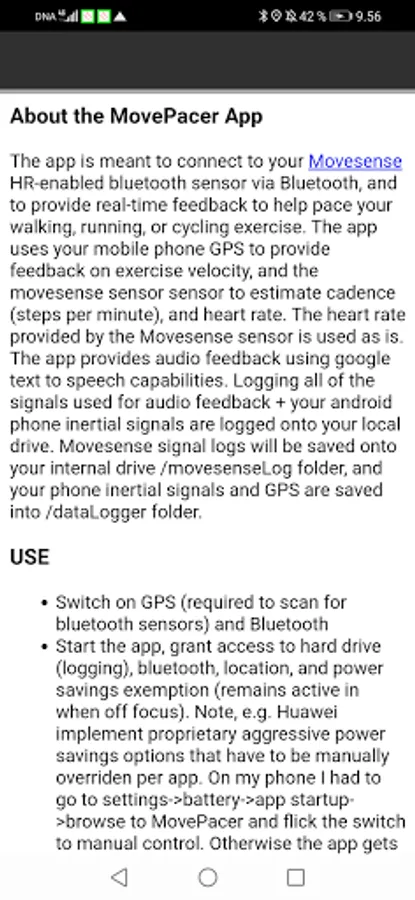 Of note, has high power consumption. Android will turn the app off automatically unless you whitelist the app manually for ignoring power optimisations (something akin to Settings -> Battery -> Energy Saver -> MovePacer and turn the selections for power consumption optimisations off).