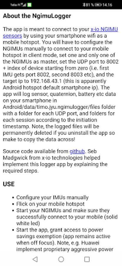 The app is meant to connect to your (https://x-io.co.uk) x-io NGIMU sensors by using your smartphone wifi as a mobile hotspot. You will have to configure the NGIMUs manually to connect to your mobile hotspot in client mode, set one and only one of the NGIMUs as master, set the UDP port to 8002 + index of device starting from zero (i.e. first IMU gets port 8002, second 8003 etc), and the target ip to 192.168.43.1 (this is apparently Android hotspot default smartphone ip). The app will log sensor, quaternion, battery etc data on your smartphone in Android/data/timo.jyu.ngimulogger/files folder with a folder for each UDP port, and folders for each session according to the initiation timestamp. Note, the logged files will be permanently deleted if you uninstall the app so make to copy the data across!