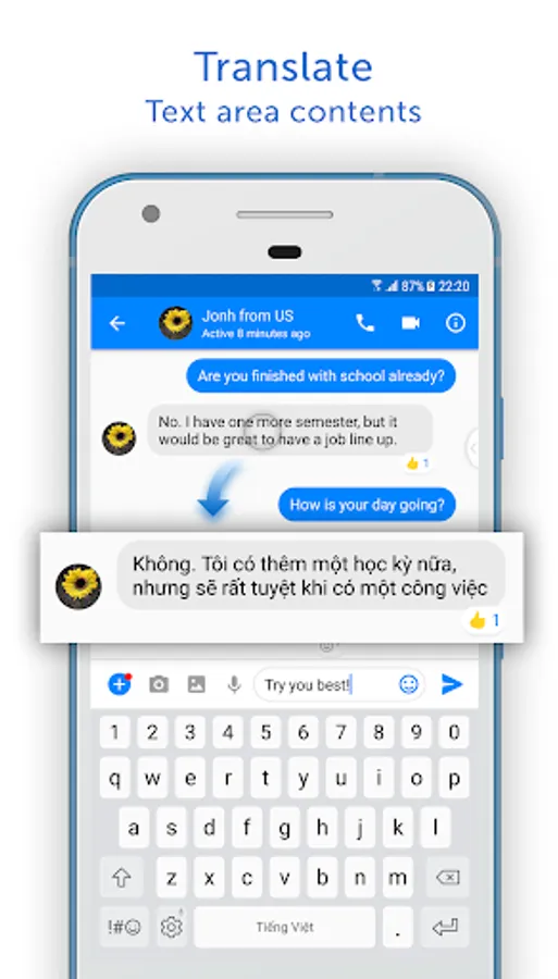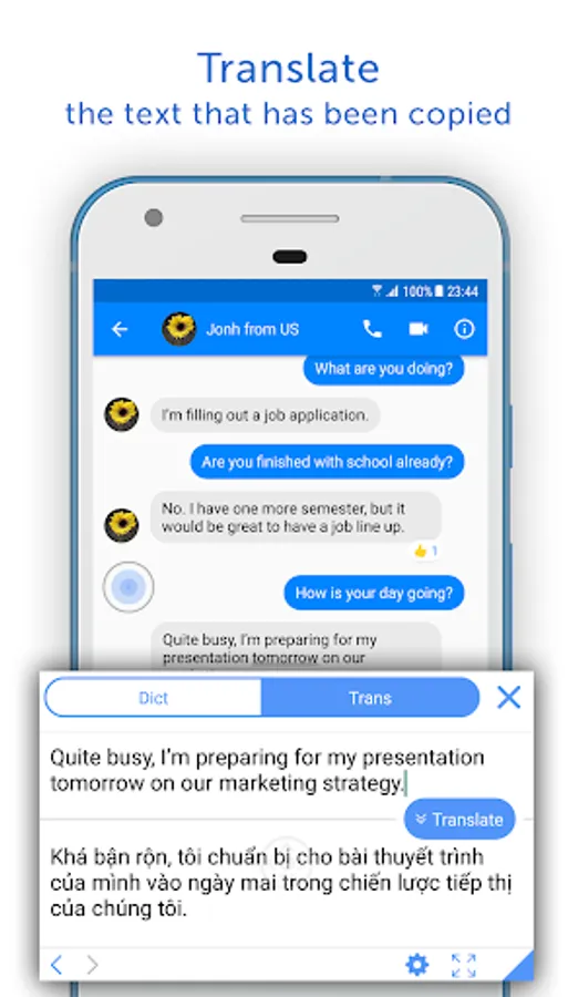 Translate anything in typing messenger with your friends when chating Whatsapp, Facebook messenger or any instant message application.