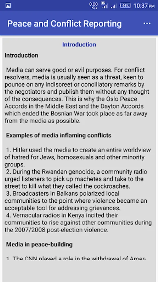 This app is designed as a toolkit for journalists and reporters. It is aimed at equipping journalists with skills to transform conflicts from their violent channels into constructive forms by conceptualizing news, empowering the voiceless and seeking common grounds that unify rather than divide human societies.