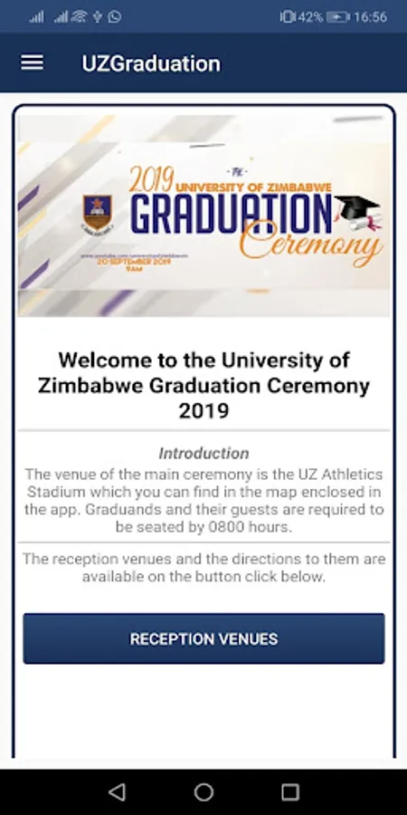 This application is the official app for the graduation ceremony of the University of Zimbabwe to be held on Friday 20 September 2019. All attendees and viewers of the event are expected to have it for easy navigation through the ceremony.