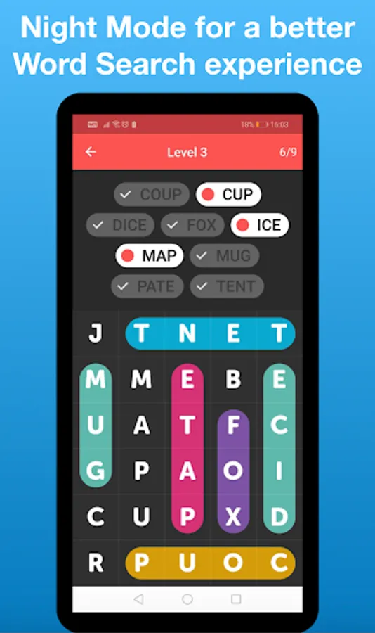 Classic word search puzzle game. Fast and mobile battery friendly offline word search puzzles.