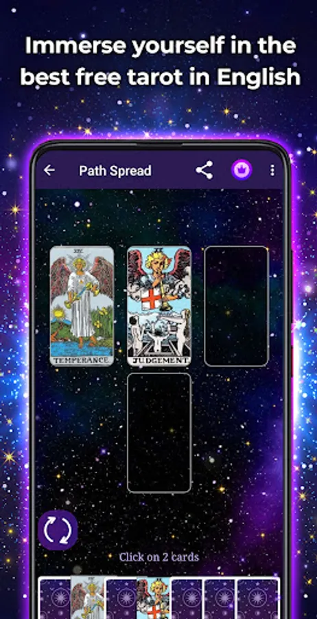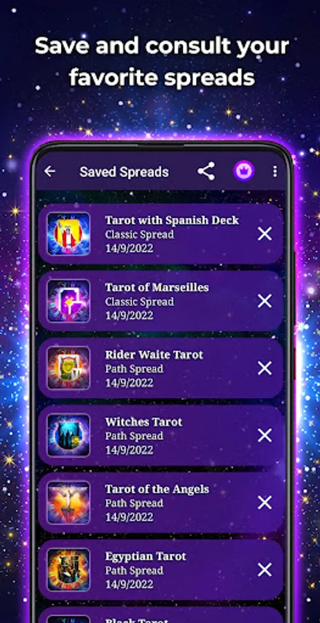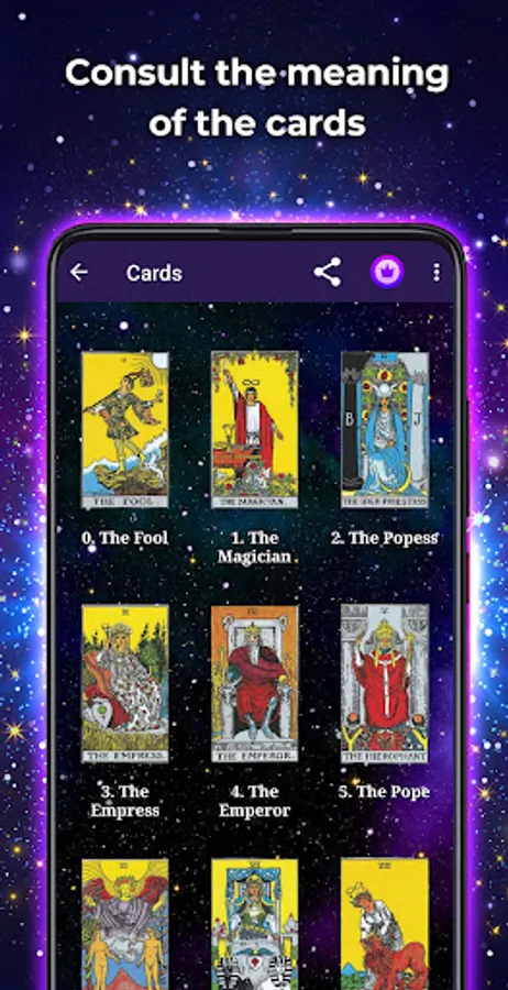 - Access the meaning of all the cards. This will allow you to use the application as a complement to spreads with real cards or simply to learn.