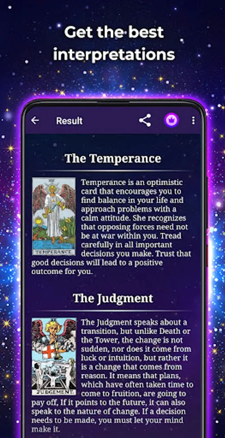 We have worked hard to offer you the best experience of cartomancy, an experience that is as close as possible to a real session with a tarot reader. No matter what your experience is, thanks to the interpretation of the cards, the app is suitable for novices and experts.