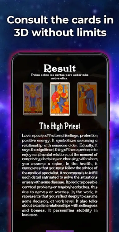 Tarot Real Gratis is a 3D tarot print application. This Free Tarot application is created to solve all your doubts about multiple issues, such as money, health, love, and much more.