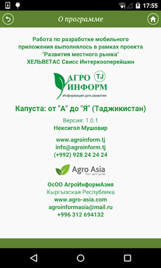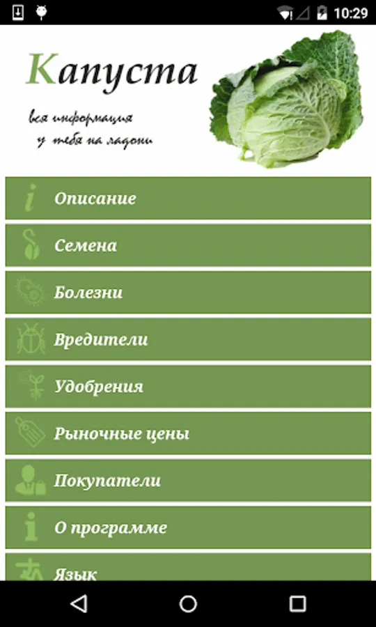 The mobile application provides information on the cultivation of cabbage: existing diseases and pests in the region, different ways of pest control and fighting against them, including the use of organic plant protection materials. The mobile application provides the ability of the direct connection of the farmer to the suppliers of seeds, plant protection products, traders and processors. There is a function of obtaining retail market prices for cabbage in Kyrgyzstan and Tajikistan.