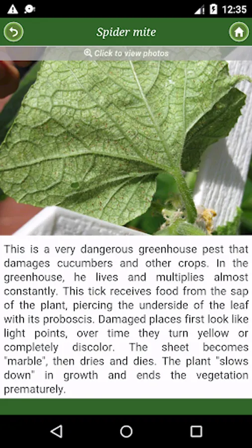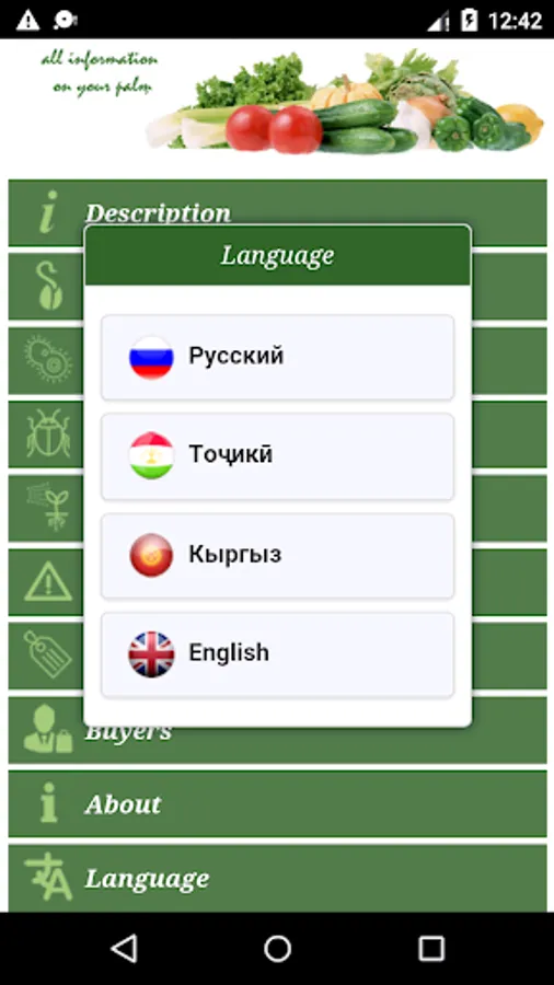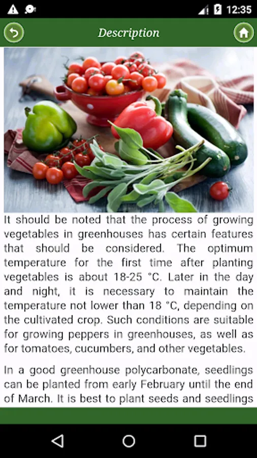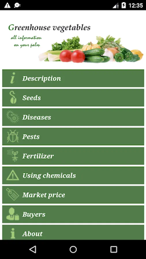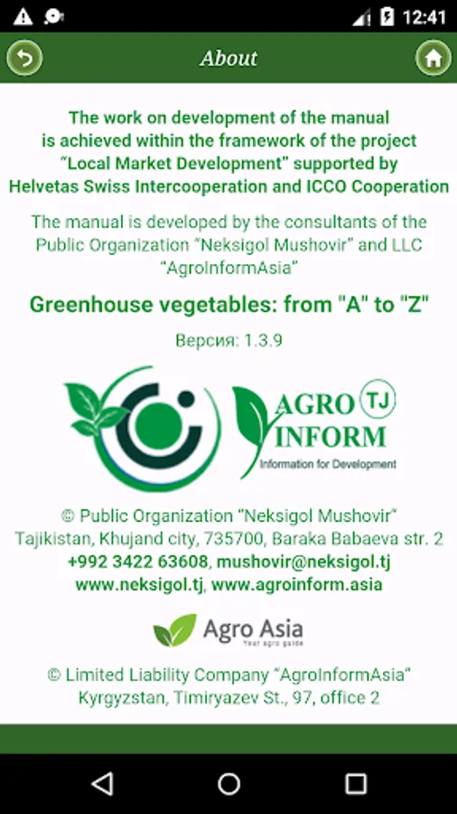 The app provide information on growing greenhouse vegetables. The application is a tool to obtain information about existing diseases and pests in the region and ways to protect crops, including the use of organic materials for plant protection. In addition, the mobile application can link farmers with the suppliers of seeds, plant protection products and other means of production, as well as with potential buyers, which presented in the application. In addition, the application provides information about the market prices.