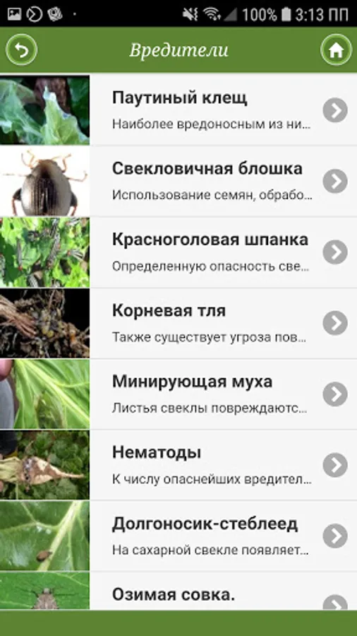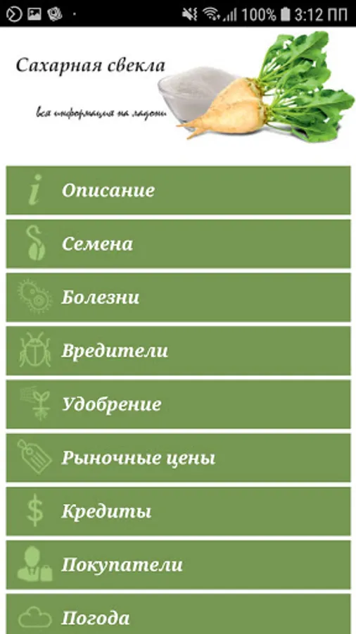 The app provides information on the cultivation of sugar beets. This application is a tool for obtaining information about existing diseases and pests in the region and how to protect against them, including the use of organic plant protection materials. In addition, the mobile application can connect farmers with suppliers of seeds, plant protection products and other means of production, as well as potential buyers, information about which is presented in the mobile application. In addition, in the application you can find out the market prices for sugar beets and the weather forecast.