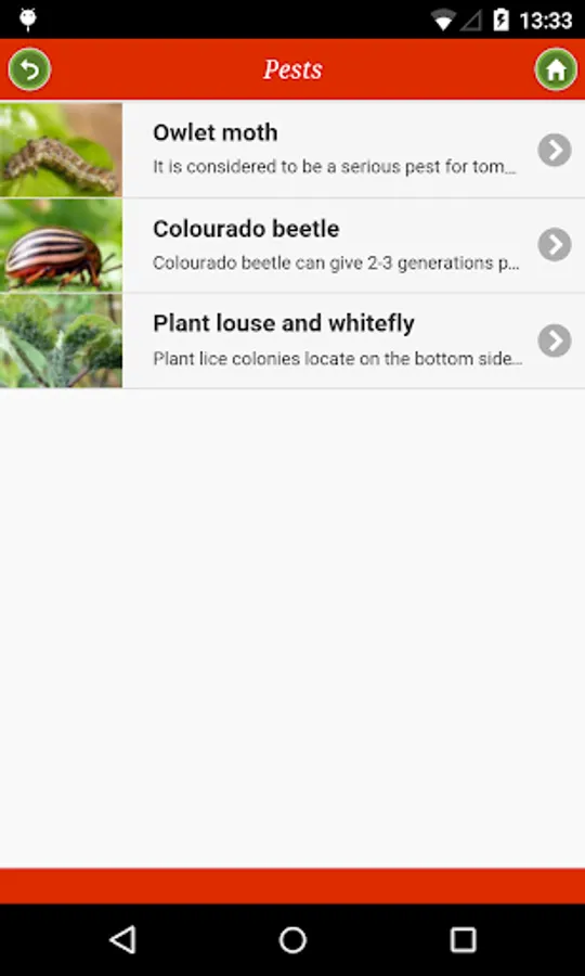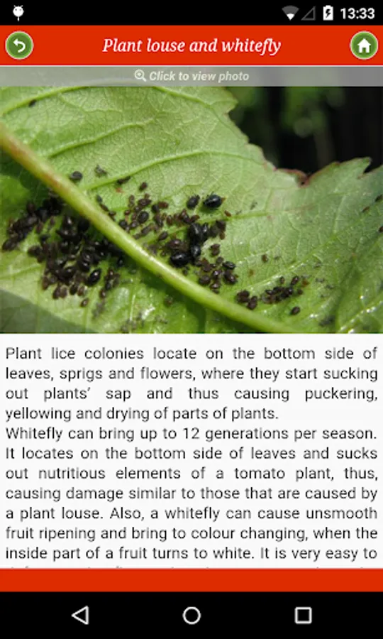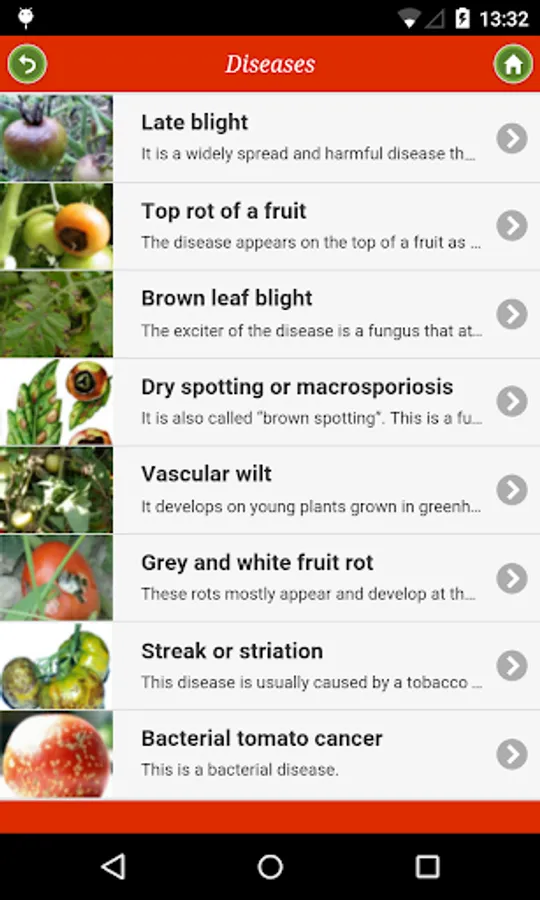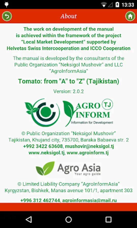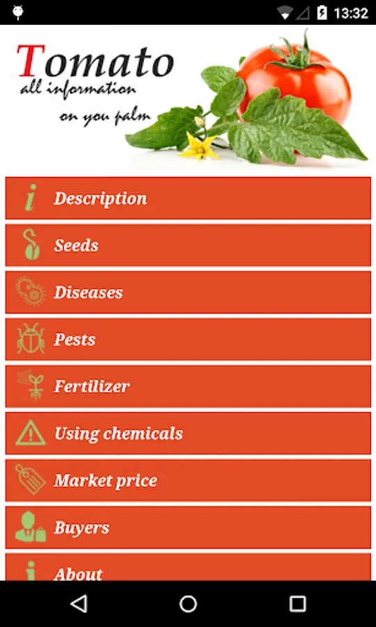 The app provide information on growing tomato. The application is a tool to obtain information about existing diseases and pests in the region and ways to protect crops, including the use of organic materials for plant protection. In addition, the mobile application can link farmers with the suppliers of seeds, plant protection products and other means of production, as well as with potential buyers, which presented in the application. In addition, the application provides information about the market prices.