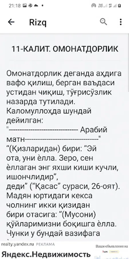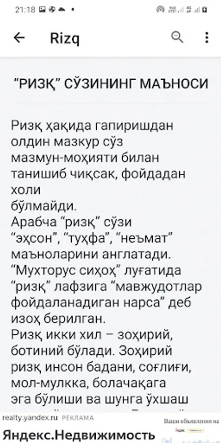 Shundai bўlsa-da, rizқ topish, tirikchilik qilish inson diққat markazida turadi, vakhti kelsa, tinchini buzadi, gam-tashvishga soladi, oromini ўғirlaidi. Rizq topishga, boilik tўplashga kandai munosabatda bўlish etiqodga boglik. Mumin kishi birinchi galda niyatini tughrilab oladi, boshkalar kundalik vazifa deb biladigan ishlarni bazharish orkali katta azhr-savoblarga erishadi. Din-diyonatsiz kimsa esa faqat ўtkinchi huzur-halatni kўzlaidi, ilozhi boricha besh kunlik dunyod rohat-farogatda yashab qolishga intiladi.