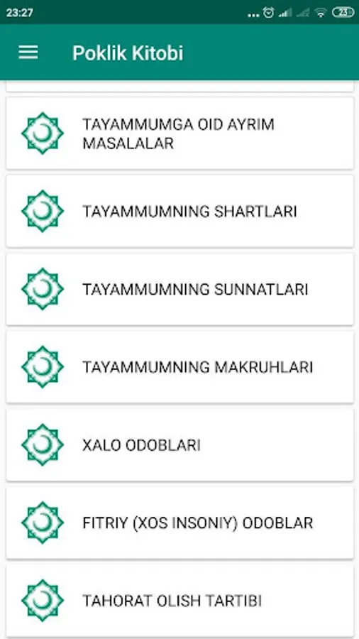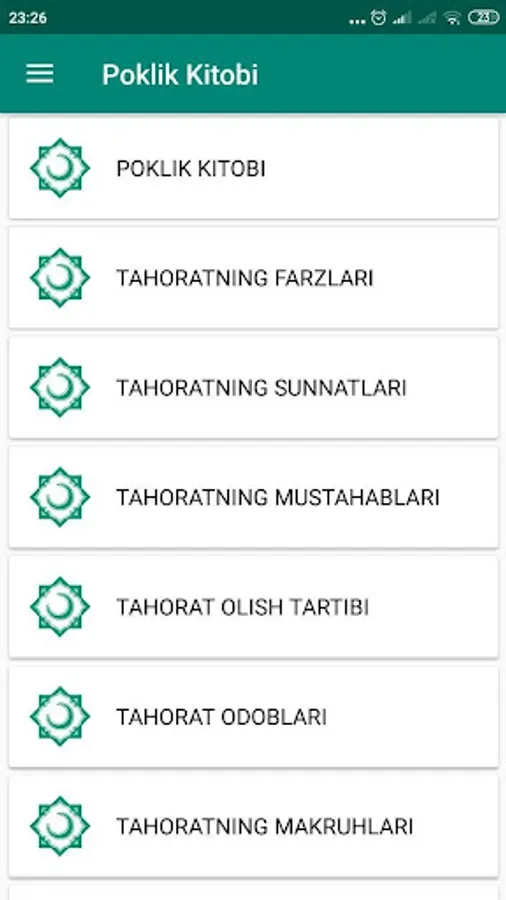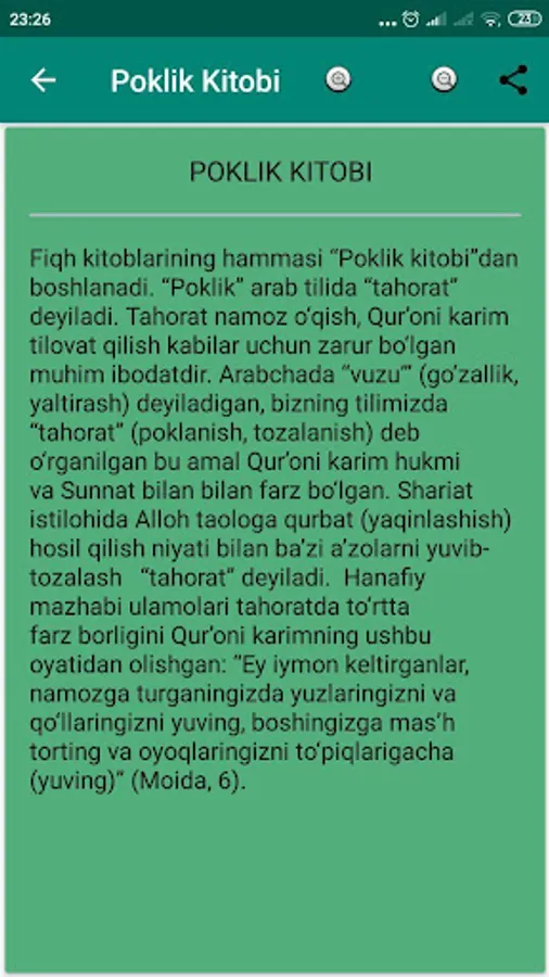 Fiqh kitoblarning hammasi * Poklik kitobi * dan boshlanadi. * Poklik * arab tilida * tahorat * deyiladi.Tahorat namoz oqish, Quroni karim tilovat qilish kabilar uchun zarur bolgan muhim ibodatdir. Pokilik kitobi: Manba: www.Islom.uz