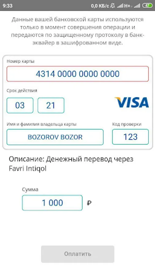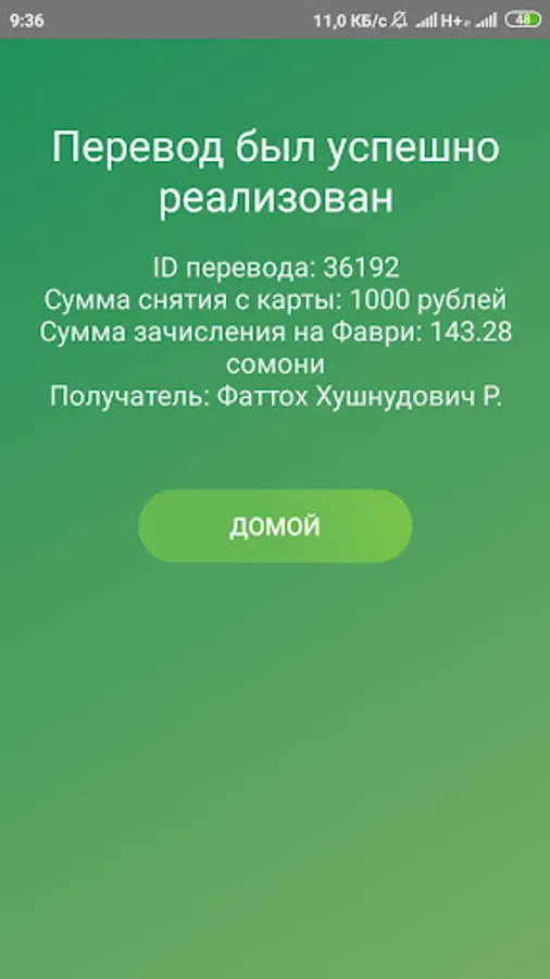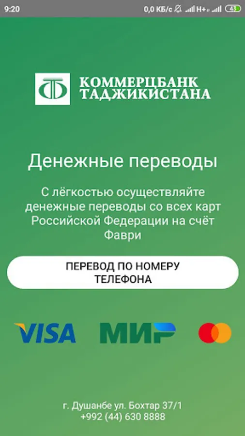 Favri Intiqol is a quick money transfer service by phone number from any cards of the Russian Federation to the Favri mobile banking account, as well as to Corti Milli cards from the Commercial Bank of Tajikistan OJSC.