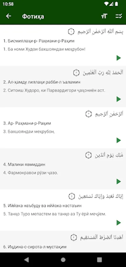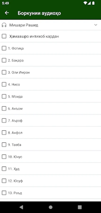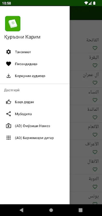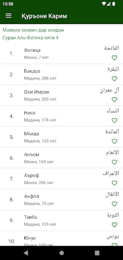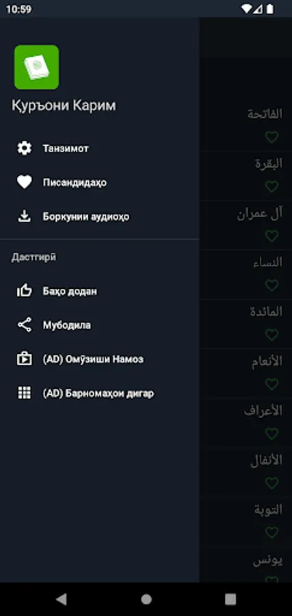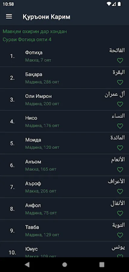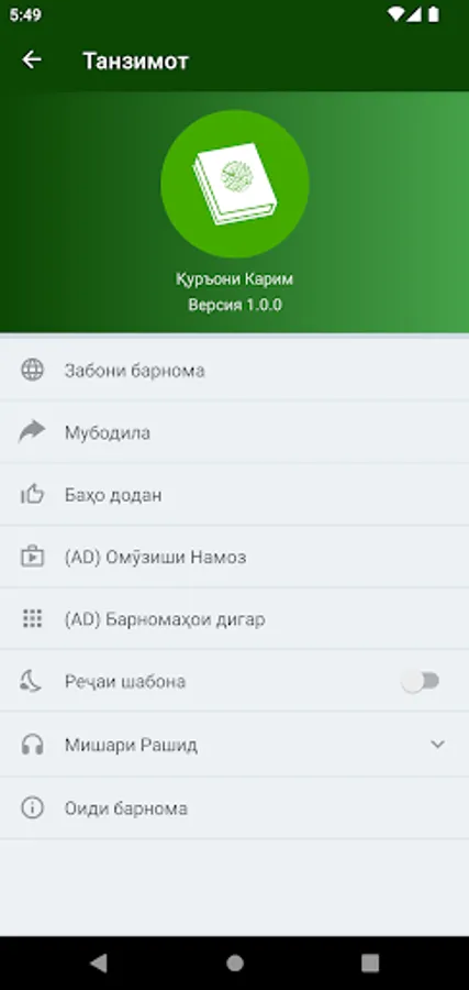 Barnomai Kuroni Karim az 114 sura iborat meboshad, baroi hondan hele kulay ast va reҷai shabona va ruzona niz mavҷud meboshad. Barnoma bo navishtaҷoti arabi, transcription and kirilli va tarhumai tohiki, rusi, uzebki kirilli va uzebkі lotinі peshnihod karda shud. Navistaҷotkhoro kalonu hurd va ayonu noayayyon cardan mumkin ast. Surai pisandidaro bo ruyhati pisandidaho bottom dohil cardan mumkin ast. Positsiyai okhirin dar hondan dar barnoma sabt karda meshavad.