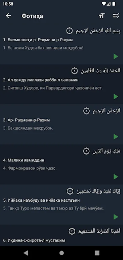 Kuroni Karim dasturi 114 suradan iborat bўlib, Ҟқish uchun zhuda қulai, kechayu kunduz tartibi ҳam mavzhud. Dastur arabic matn, Cyrillic transcription va tozhikcha, Ruscha, Uzbekcha kirilcha va lotincha Uzbekcha tarzhimalari bilan taқdim ethyldi. Matnlar katta yoki kichik, kurinadigan yoki kurinmas holga keltirilish mumkin. Sevimli surani ham sevimlilar ruykhatiga kiritish mumkin. Ohirgi ўқish position and dasturda qayd etiladi.