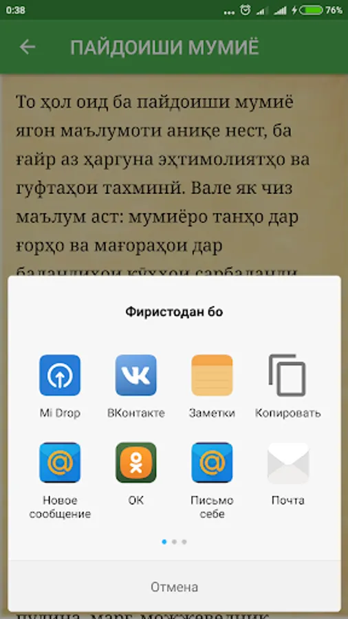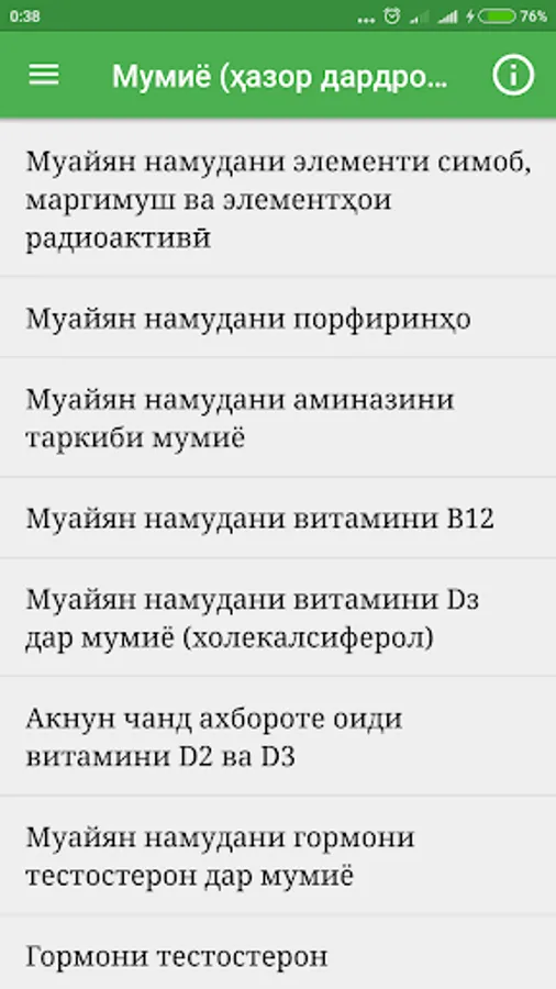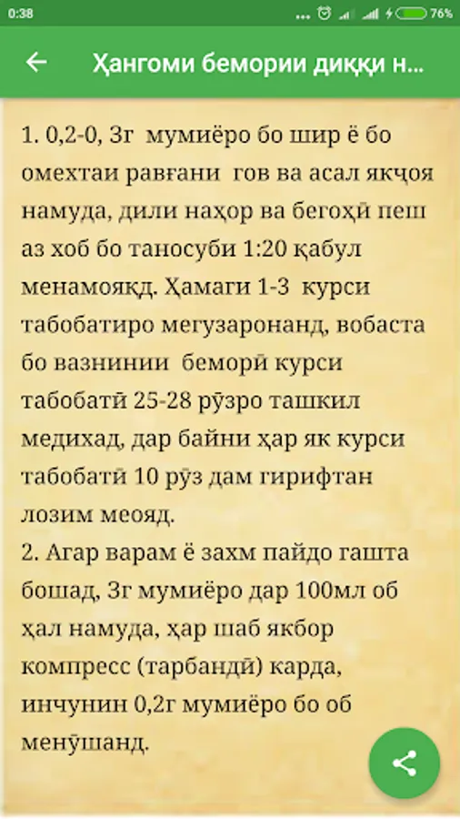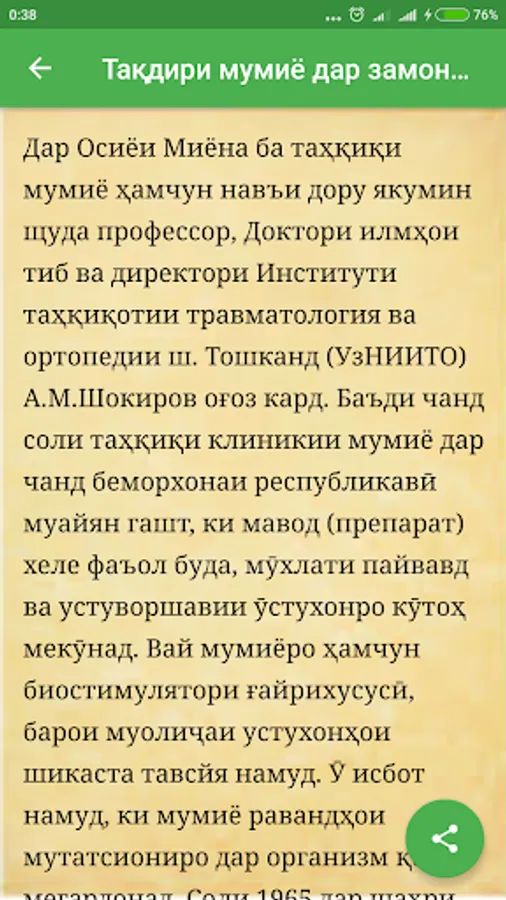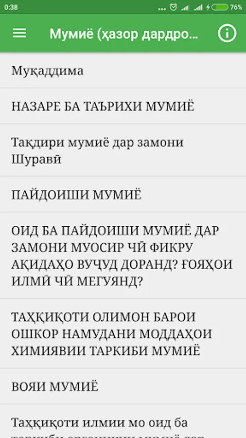 Mumiyo hamchun doru, gift tibbi mardumi az zamonkhoi kadim ma'lum meboshad, ki tarihi ҳazorsola dorad. Mumiyoro dar guzashta bisertar dar mamlakatkhoi Shark va Osiyoi Miyona baroi tabobati kasalikhoi gunogun istifoda meburdaand. Malumotkhoi ziyode nisbati hosilkunii doruvu davo wa istifodai he then zamoni mo omada rasidaasd. Az risolahoi dastnavisi Tibet, Hinduston, Muguliston va Osiyoi Miyona ma'lum megardad, ki dar vaktkhoi kadim talabot va tavaҷchүҳ ba nav'i doru hele ziyod budaast.