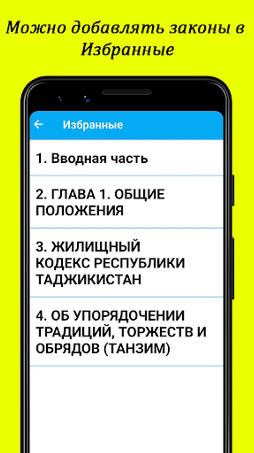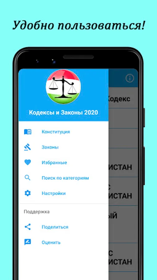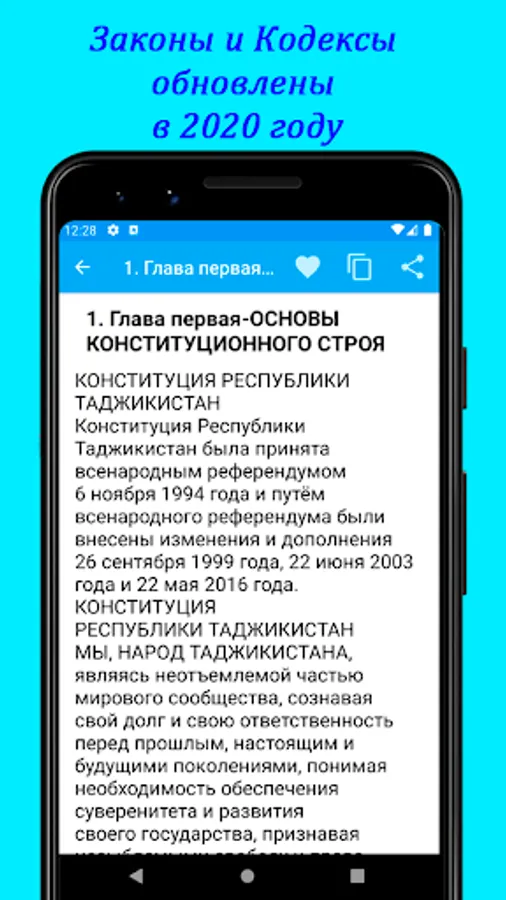 The application contains all the Codes and Laws including "TANZIM", the Constitution of the Republic of Tajikistan, the Tax Code, the Civil Code and all others.