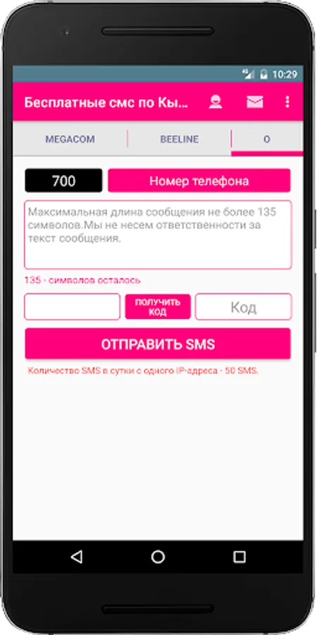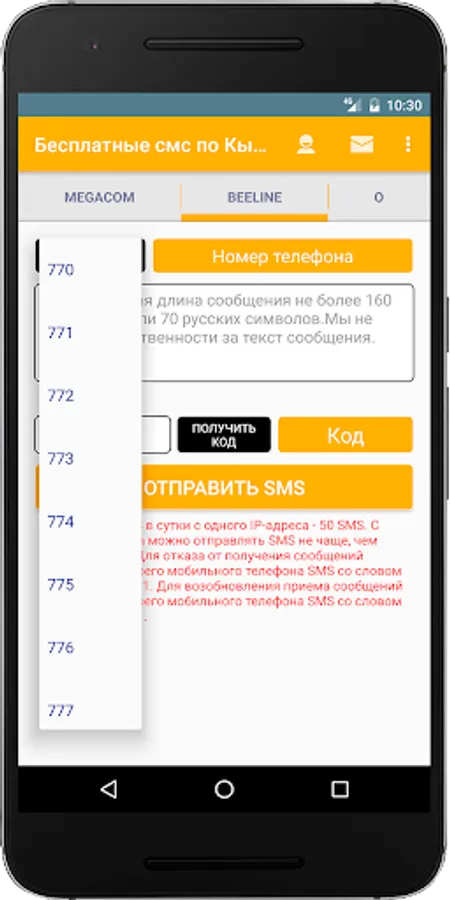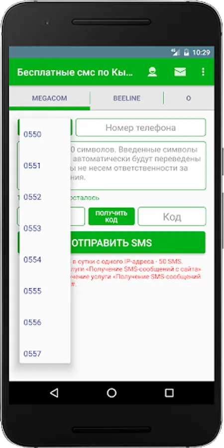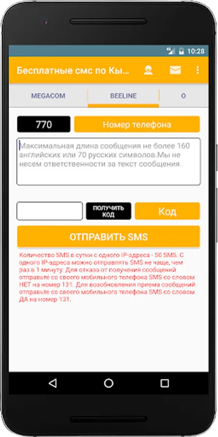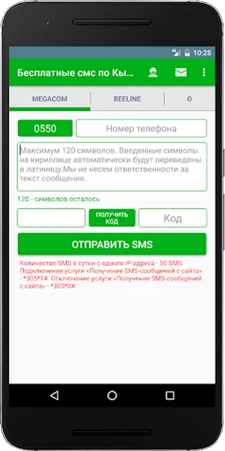 Send SMS for free to any number of mobile operators in Kyrgyzstan from your phone. Sending to subscribers O operators, Beeline and Megacom. This application requires internet connection. For sending SMS is enough to know only the number of subscribers.