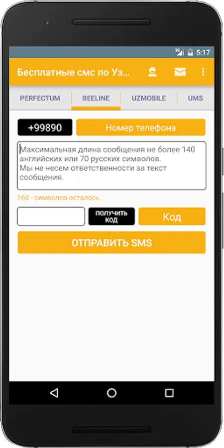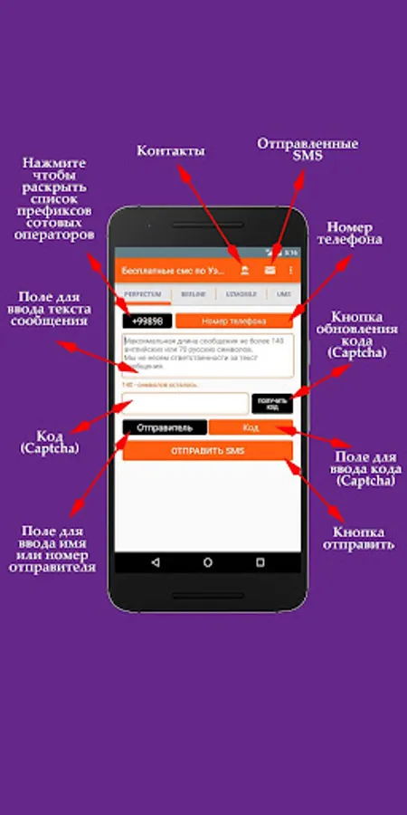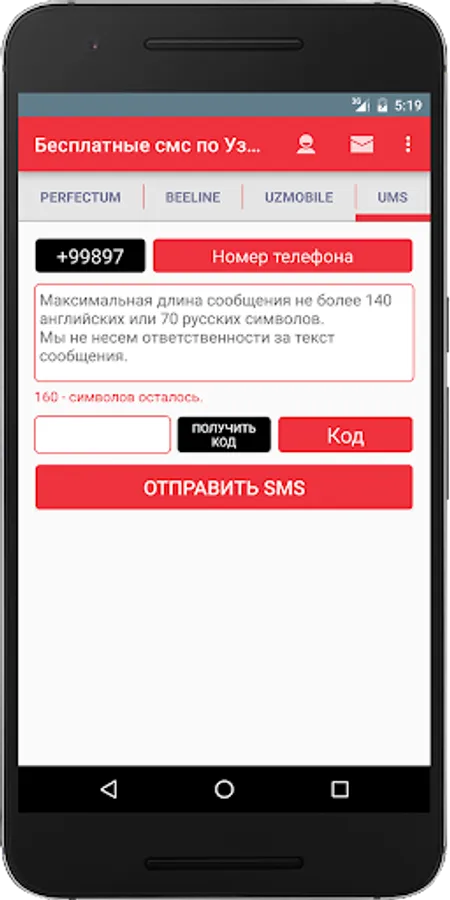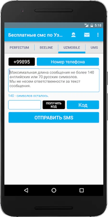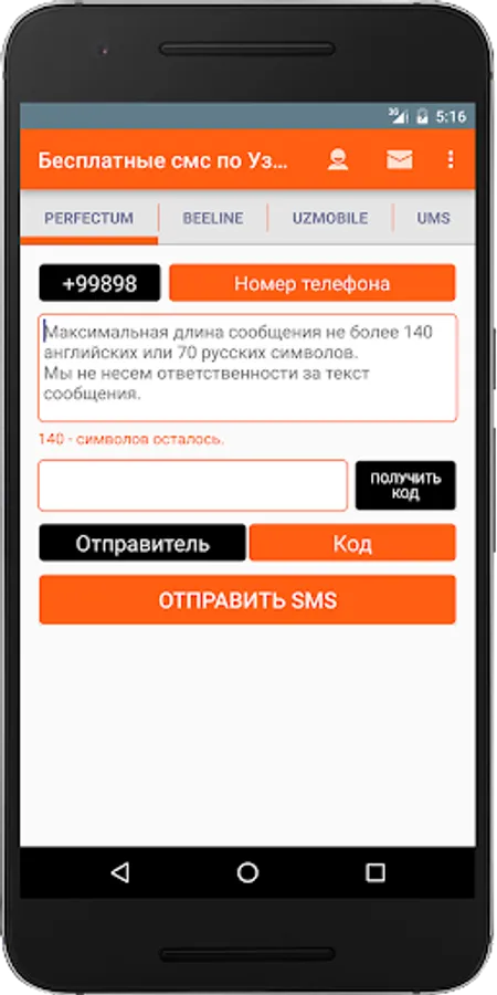 Send SMS for free to any number of mobile operators in Uzbekistan from your phone. Sending to subscribers Perfectum operators, Beeline, Uzmobile and UMS. This application requires internet connection. For sending SMS is enough to know only the number of subscribers.