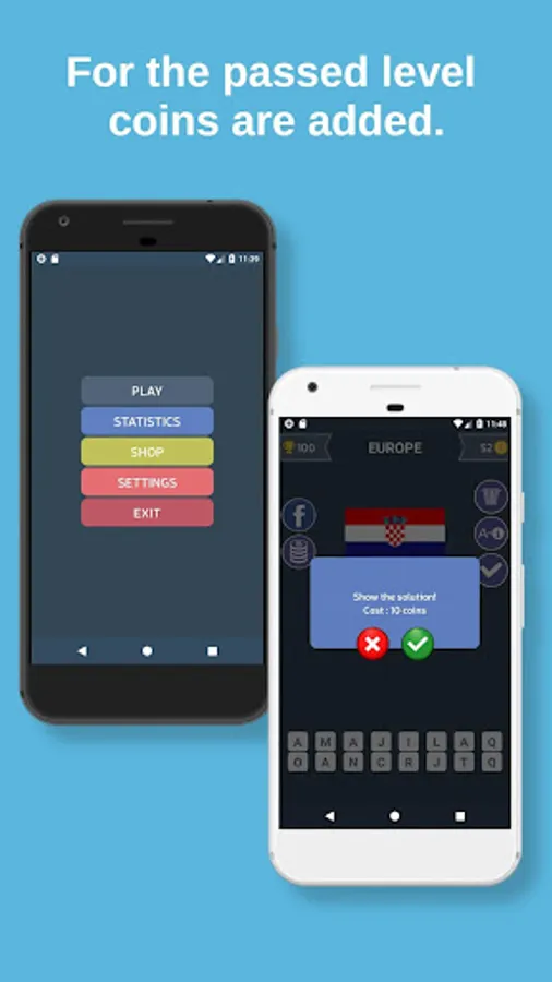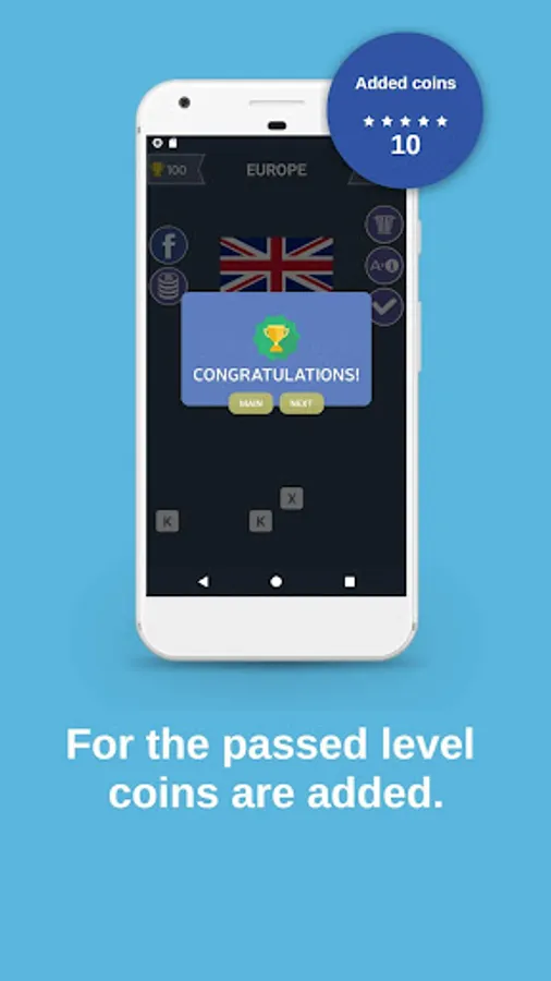 Flags Quiz is game full of fun that consists on guessing the names of hundreds of flags around the world. Advance thorough levels of difficulty and strive for the highest score possible. The more flags you guess the more coins you will earn. If you get stuck and don't know an answer, don't give up! use the coins you gathered to get hints or remove unnecessary letters. If you are still stuck try asking your friends on Facebook.