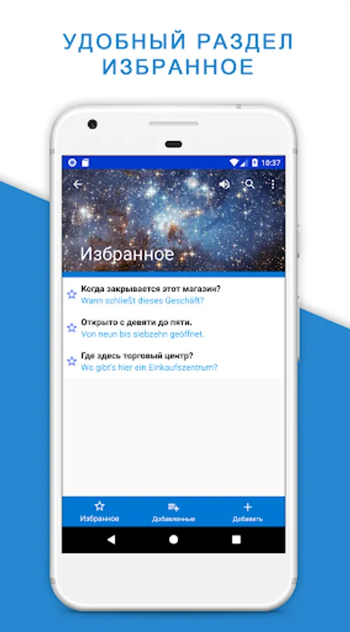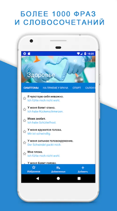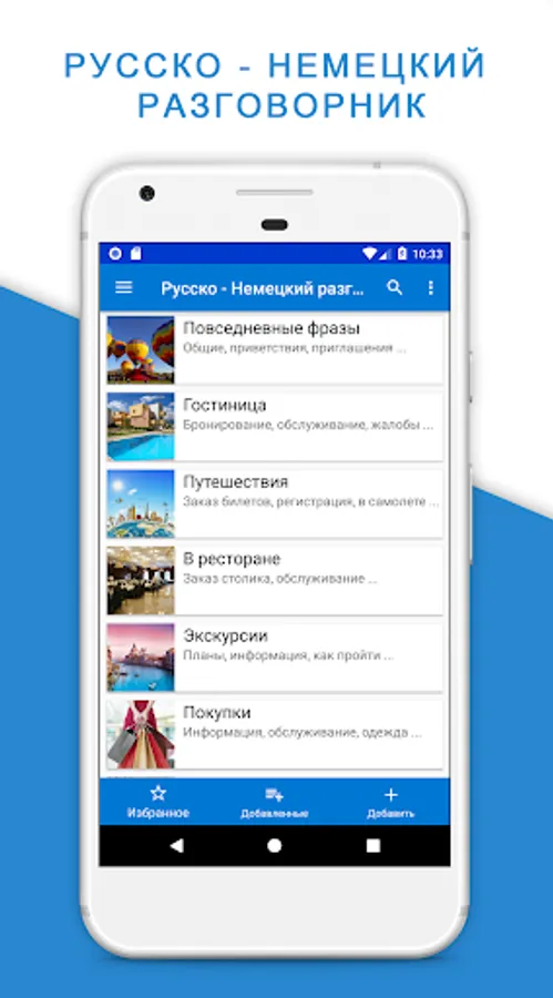 A Russian - German phrase book will also help you in learning and improving the language: it is possible to save phrases in the "Favorites" section for quick access and further practice of pronunciation.