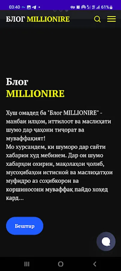 Барномаи Блог MILLIONAIRE барномаи мобилии машҳур аст, ки хабарҳои муосир, мақолаҳои муфид ва мундариҷаи илҳомбахшро дар бораи тиҷорат ва муваффақият пешниҳод мекунад. Акнун шумо имкон доред, ки ба маълумоти навтарин ва мундариҷаи ҷолиб бевосита дар дастгоҳи мобилии худ дастрасӣ пайдо кунед.