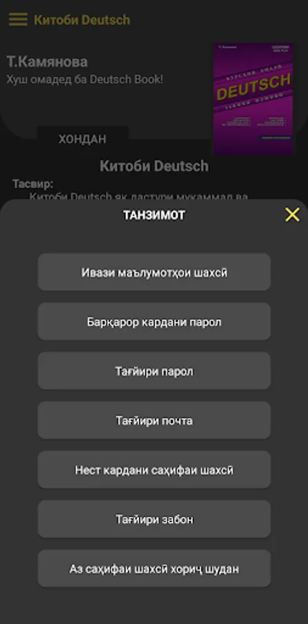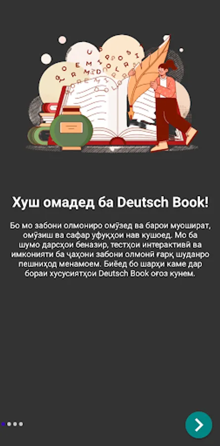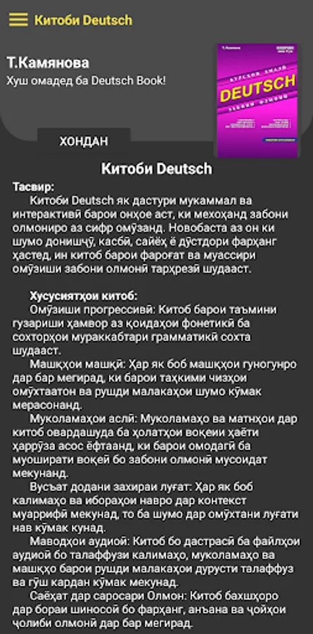 Китоби "Deutsch" як дастури мукаммал ва интерактивӣ барои онҳое аст, ки мехоҳанд забони олмониро аз сифр омӯзанд. Новобаста аз он ки шумо донишҷӯ, касбӣ, сайёҳ ё дӯстдори фарҳанг ҳастед, ин китоб барои фароғат ва муассири омӯзиши забони олмонӣ тарҳрезӣ шудааст.