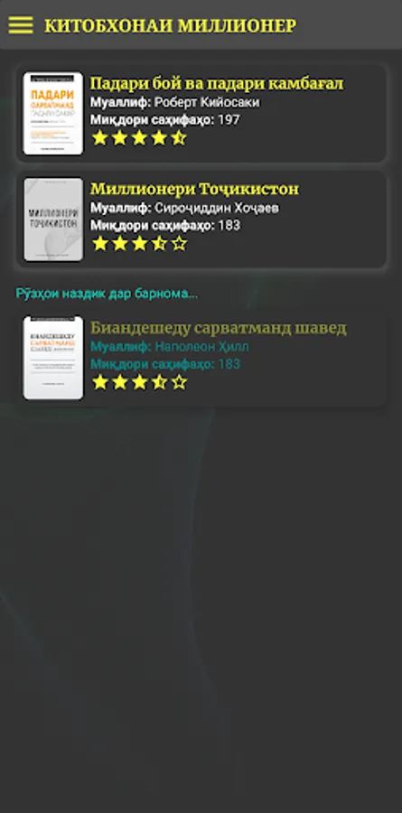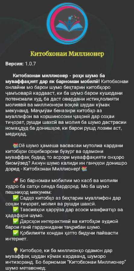 💡 Китобҳое, ки ба миллионҳо одамон дар муваффақ шудан кӯмак кардаанд, шуморо интизоранд. Бо барномаи “Китобхонаи Миллионер” шумо метавонед: