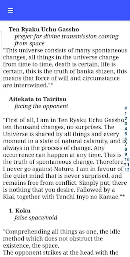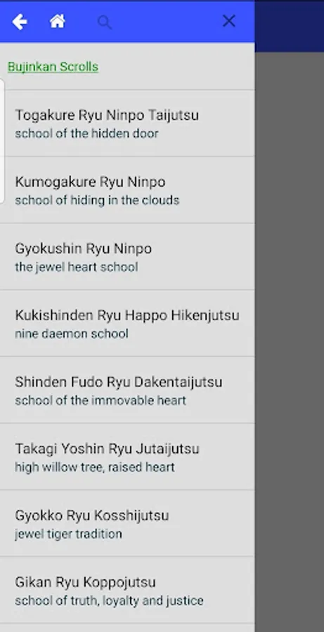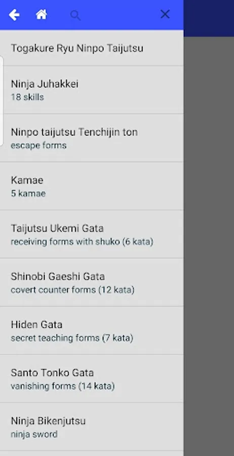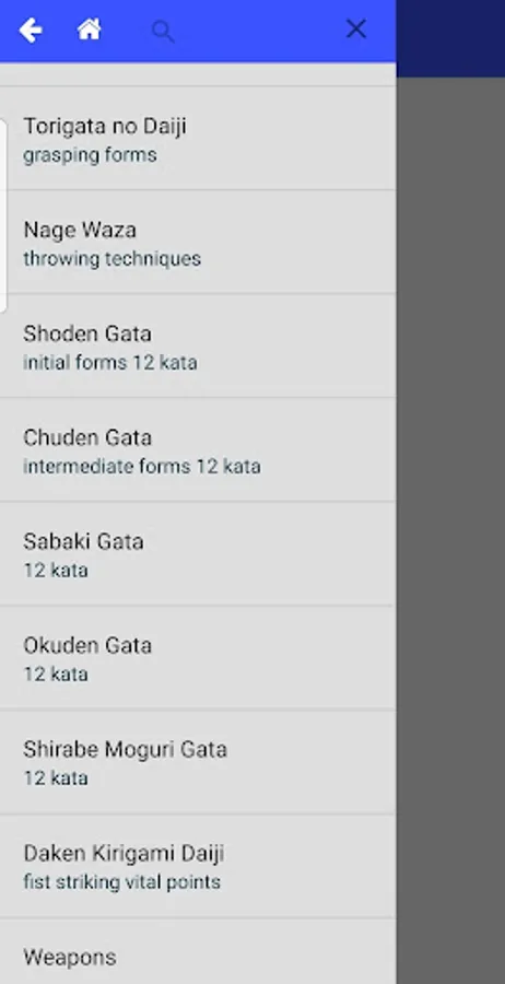 The app allows you to browse the kata grouped as in the scrolls and to quickly look up a specific technique for reference when training, or just out of curiosity.