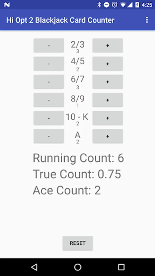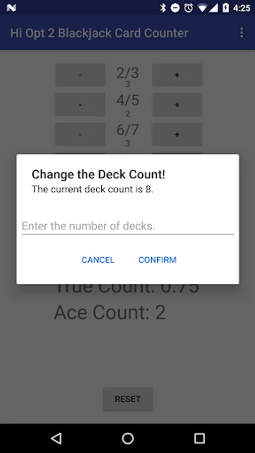 Multiple decks? No problem. The hi opt 2 system allows for users to count counts and create an edge even when multiple decks are being used. Simply plug in the number of decks being used in the settings tab. By default, it is set to 8 decks. Then keep track of the cards being placed by interacting with the user interface. The running count, true count (which is the running count divided by the number of decks), and ace count will be updated dynamically.