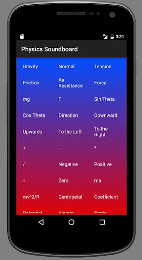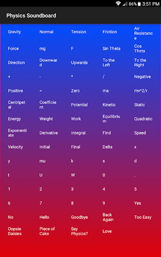 Use this soundboard in physics class to gain an edge over your classmates, or even use the app to supplement your learning while doing homework! This app is best used when drawing free body diagrams.