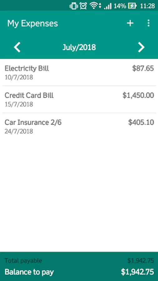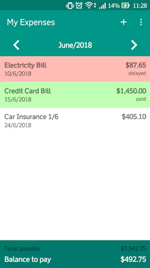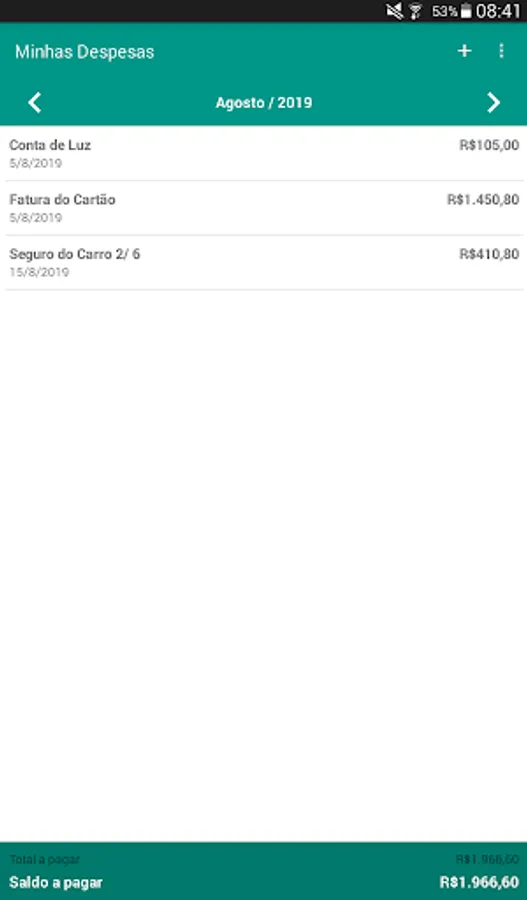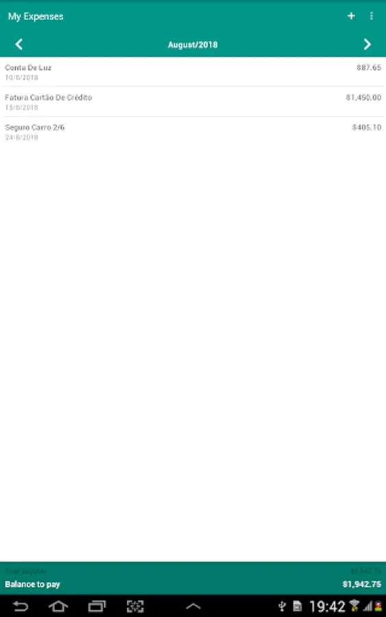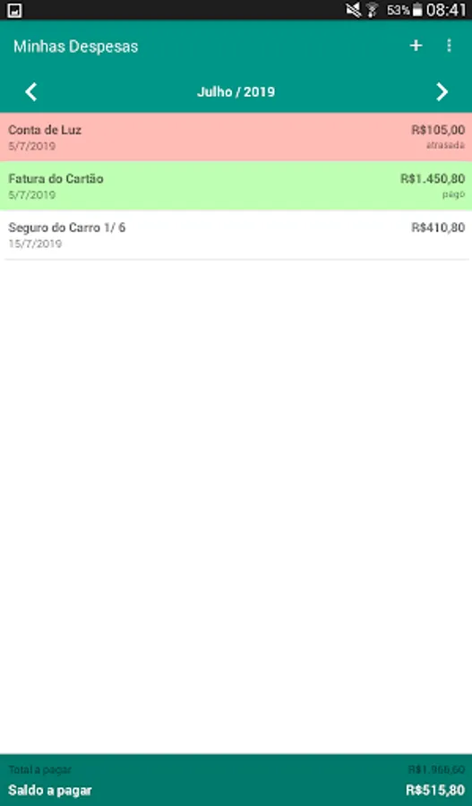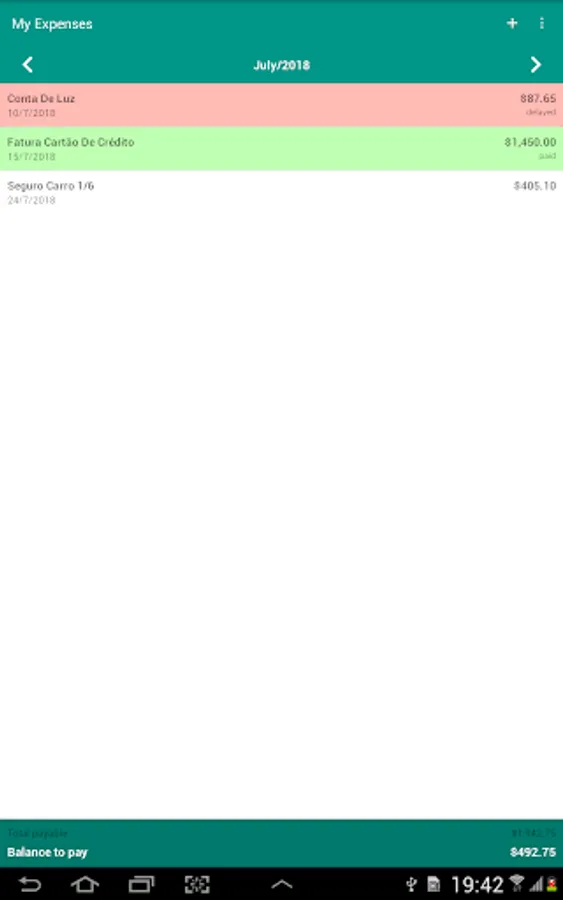 Initial Screen - is where the expenses of each month are listed. Lines with a yellow background indicate that the expense is late. Clicking on each expense opens the Detailing screen.