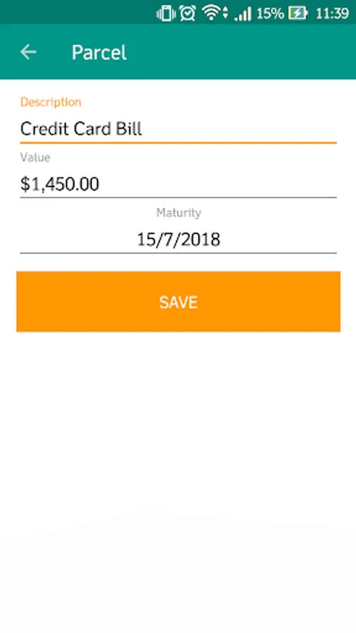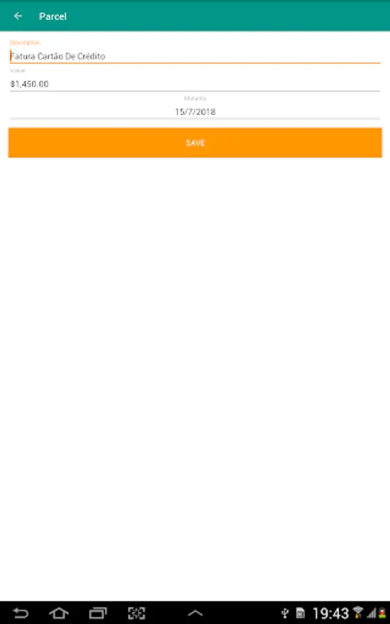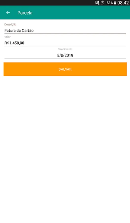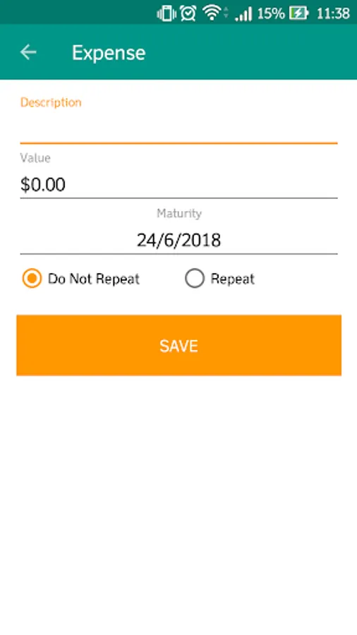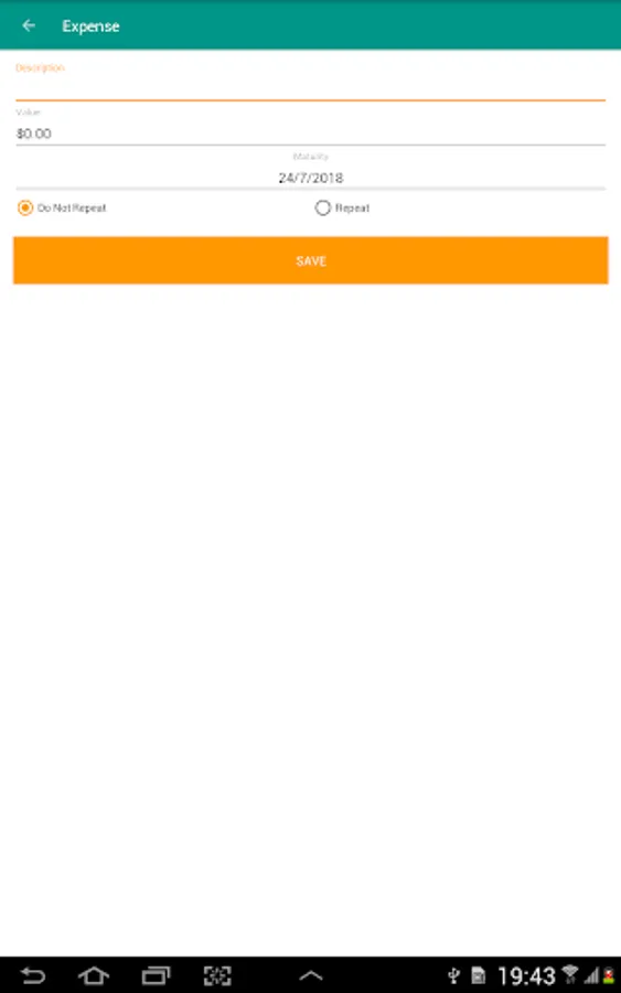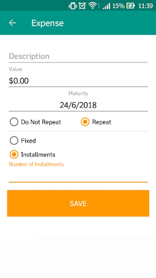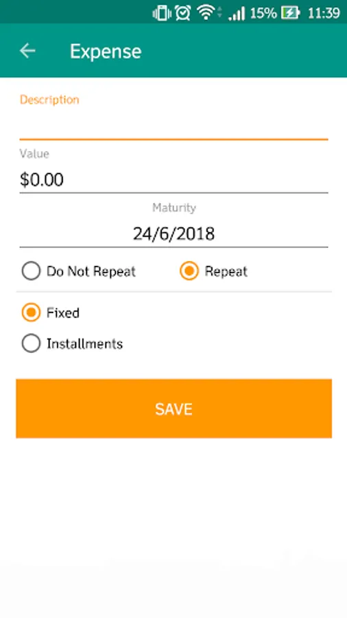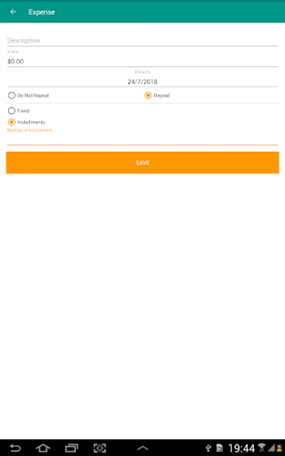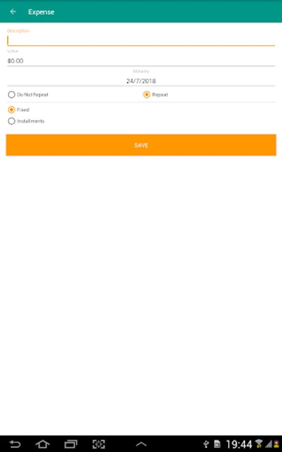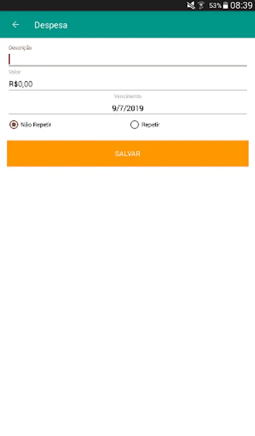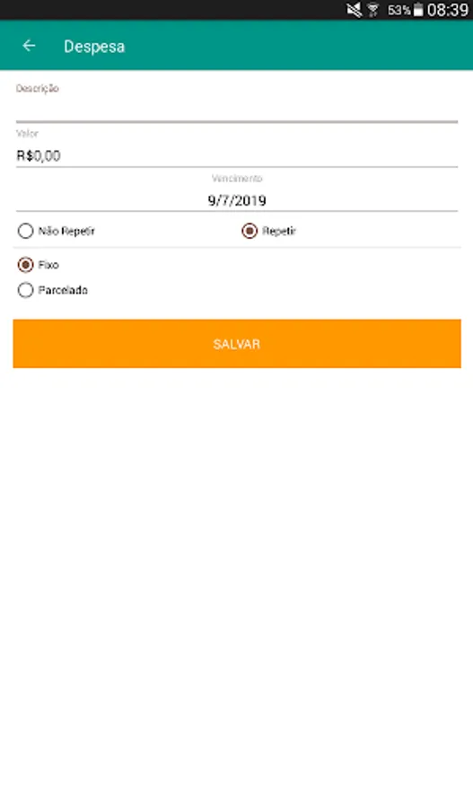 Expense screen - here is the expense record. Informing the description, value and expiration date. It is also possible to indicate if the expenditure repeats over the months of fixed form (every month) or installment (specific amount of months).