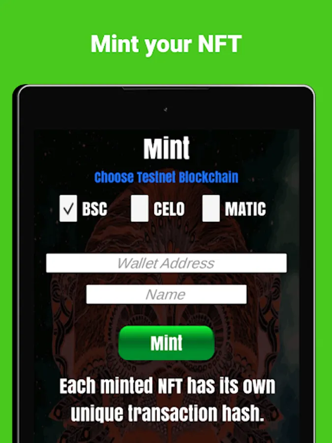 - Mint your NFT on some testnet Blockchain like Binance, CELO or Matic