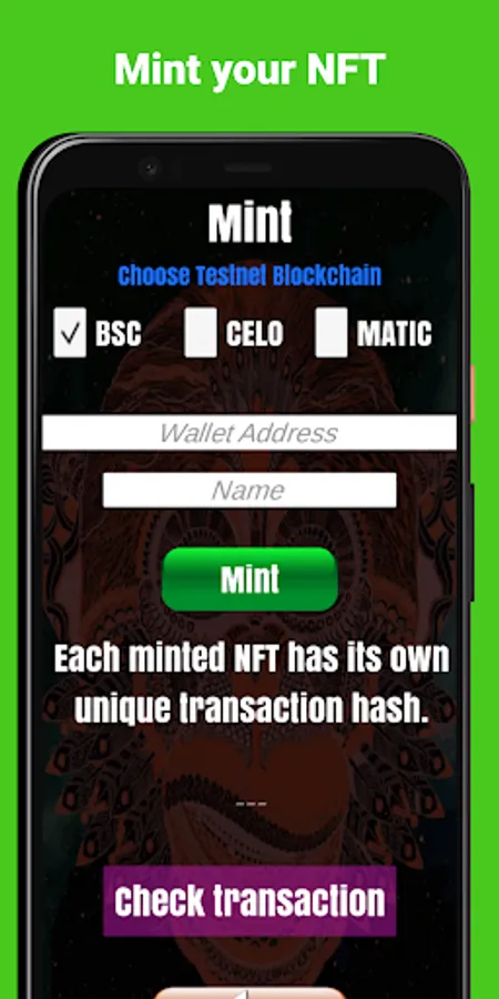 This NFT creator let you also Mint your Nft for free on the Polygon Mainnet or Testnet or CELO or Binance testnet.As a result, the blockchain gets back to you with a transaction hash
