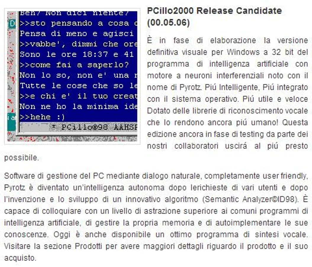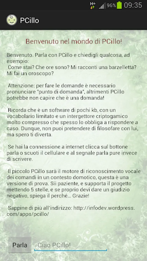 PCillo is a small analyzer speech able to understand the syntactic patterns and respond to natural language. This version is a demonstrator that works on the basis of a set of ready-made answers. PCillo can be adapted to understand commands given in natural language, customized according to end-user requirements, enriched with behaviors that allow it to automate the actions or inform of the change of the environmental characteristics.