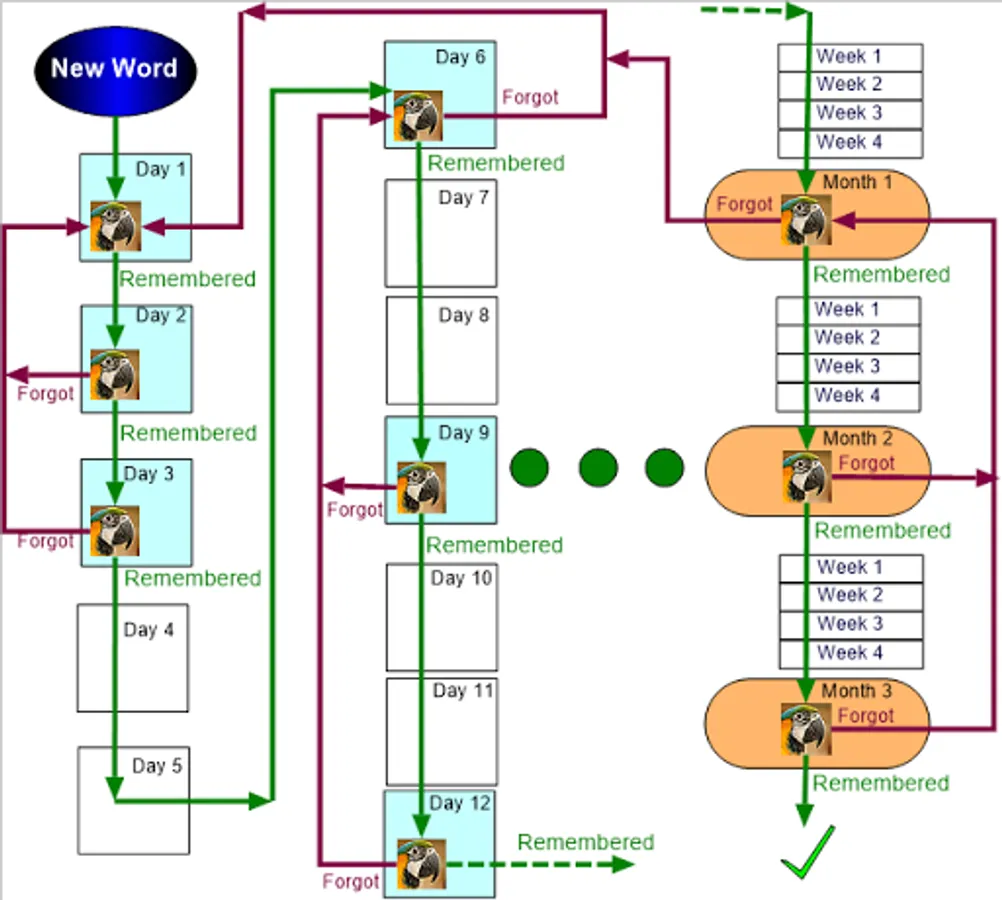 Words in the bottom class are reviewed every day. Words in the top class are reviewed once a month. In the intermediate classes, the words are reviewed once in periods that are growing from once in three days, up to once a month.