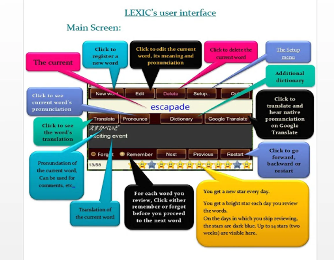Learning a second language can be frustrating, Lexic will give you a bright star every day you learn and a blue star when you neglect to study.