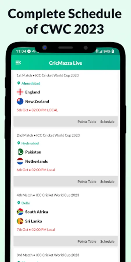 So whether you're a die-hard cricket fan or just looking to follow the ODI World Cup 2023, our app has everything you need to stay informed and engaged. Download our ODI World Cup 2023 Schedule app today and get ready to experience the excitement of the tournament like never before!
