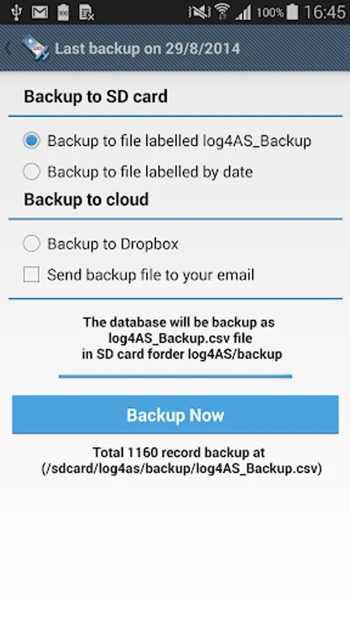 o Once you have entered data you can create a backup at any time on your SD card. When you are in range of a WiFi access point (or a GSM/3G base station if you are paying for data transmission) for which you have access you can simply use the Log4AS App to email yourself another backup file that can be held on your mail system.
