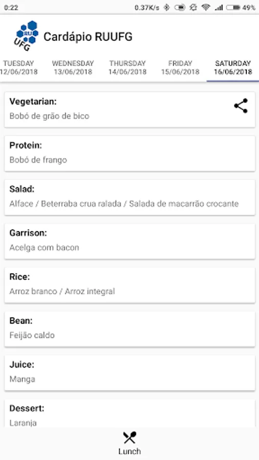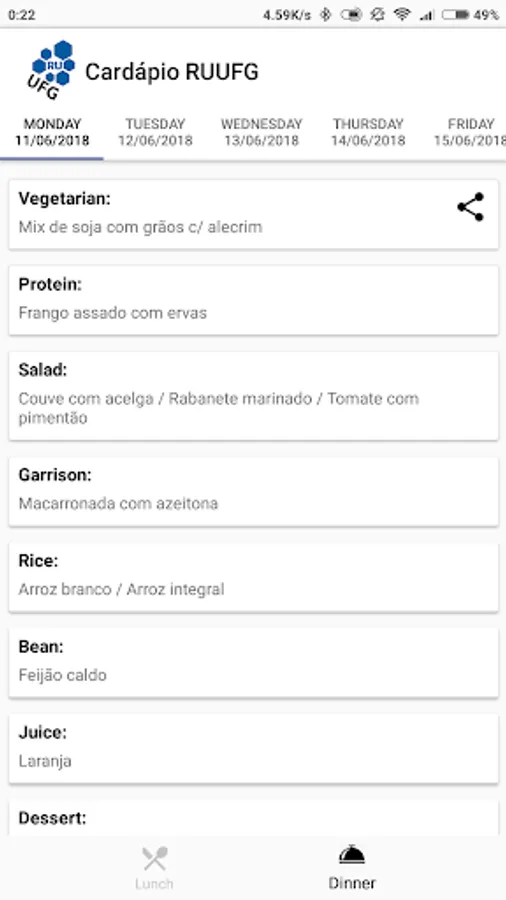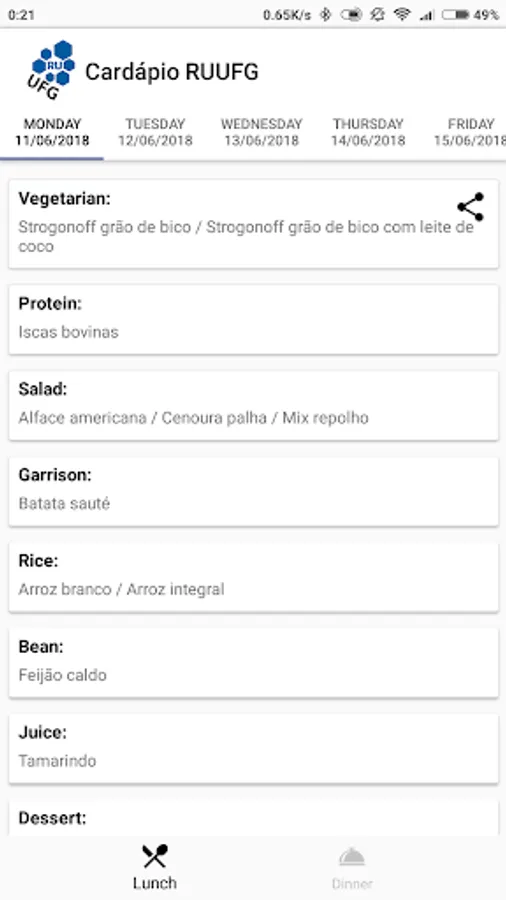 Menu of the University Restaurant of UFG (Campus Goiânia)