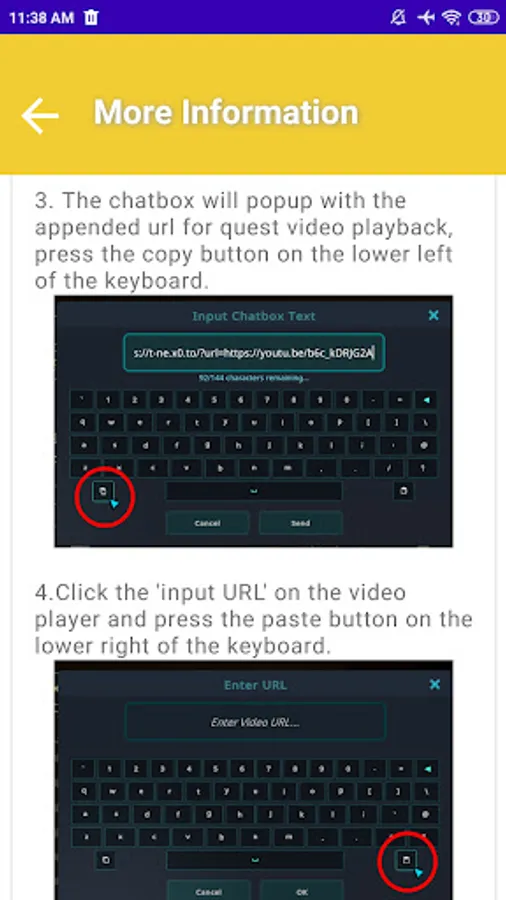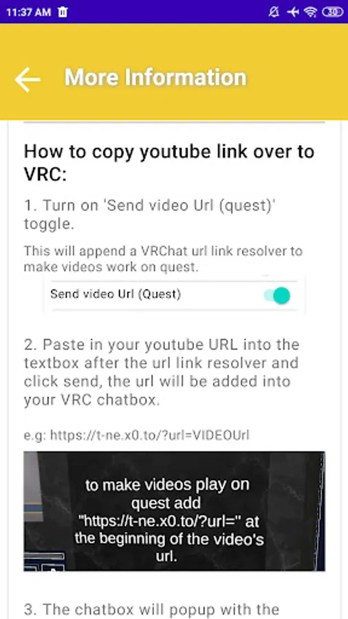 V1.1.0 - New feature: Allows users to send quest youtube/video url and paste them in game. More info on how to do that in the instructions on top right of the app.