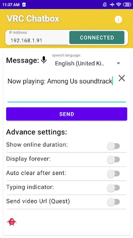 - ChatBox on phone: Type anything that you want to send over to VRChat. examples like, “Now Playing: AmongUs Soundtrack”.