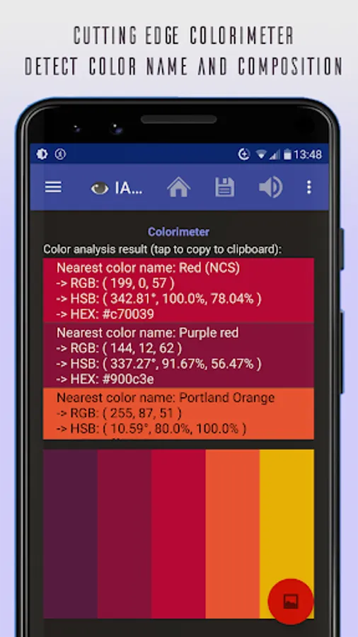 With colorimeter you can identify all colors within an image and see their representation in RGB, HSB and HEX notation. For each detected color, the app will tell you the name of the color or the name of the most similar color, in case the color tone is uncommon and has no name.