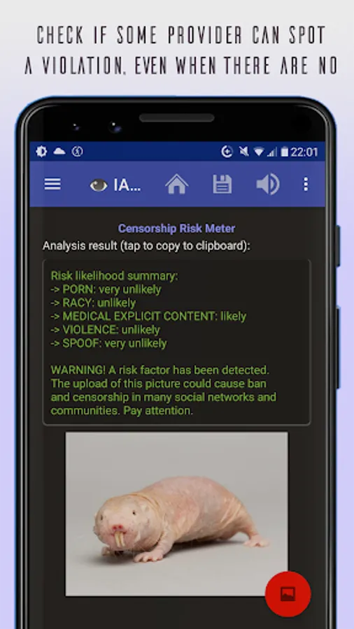 This tool allows you to check an image to determine if its content could be censored by automatic systems or lead to ban. This feature is useful since many social networks and websites perform automatic checks of the uploaded pictures and could take actions against the user if a critical content is detected.