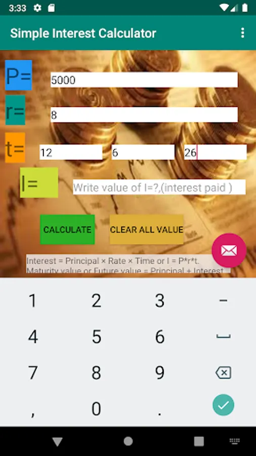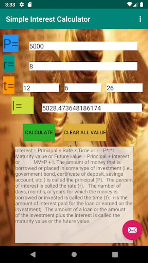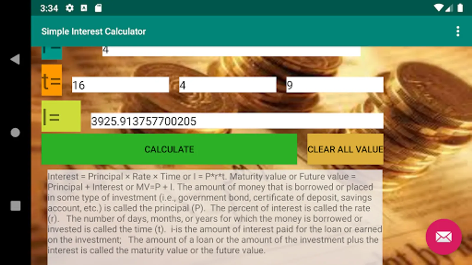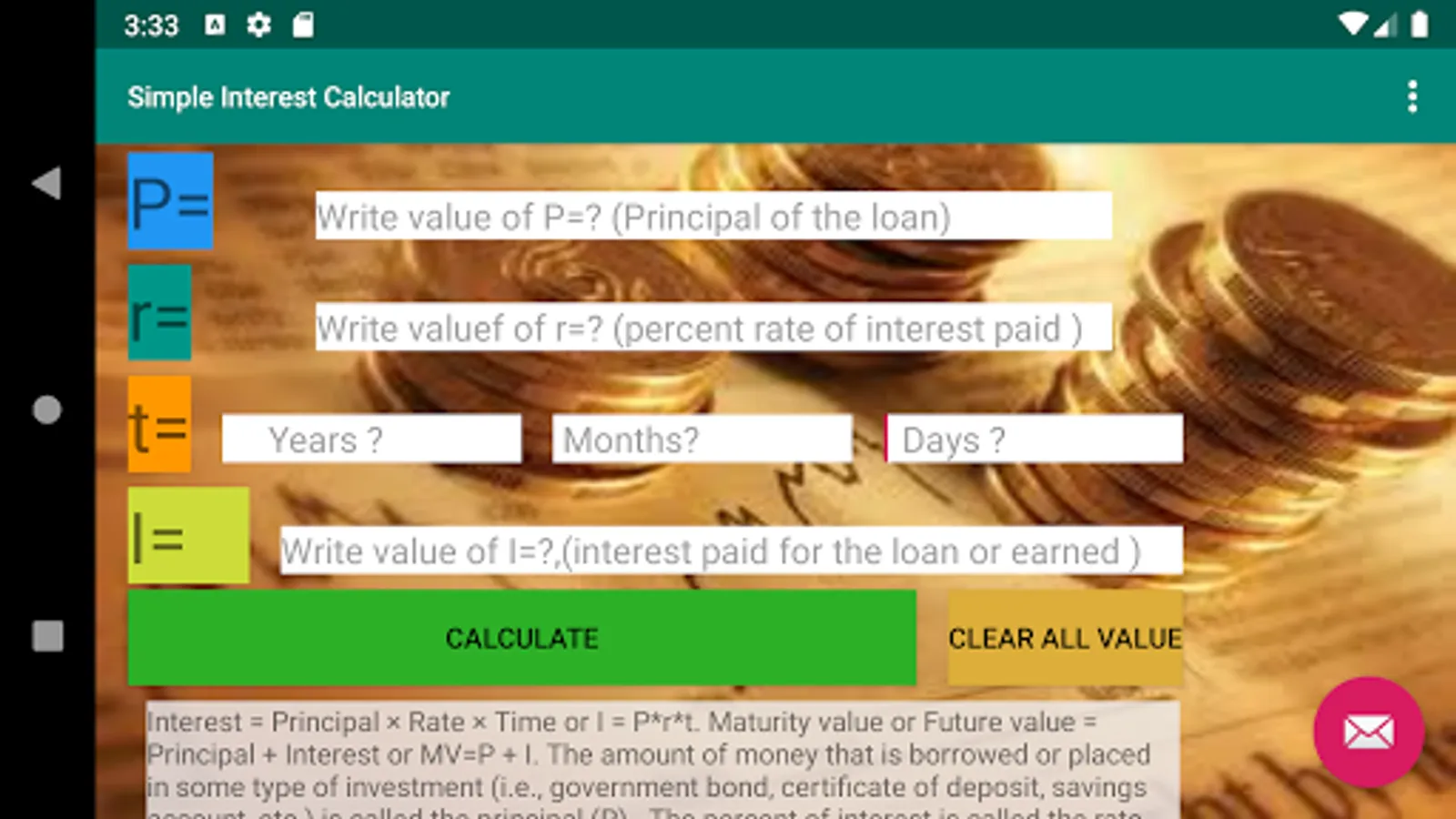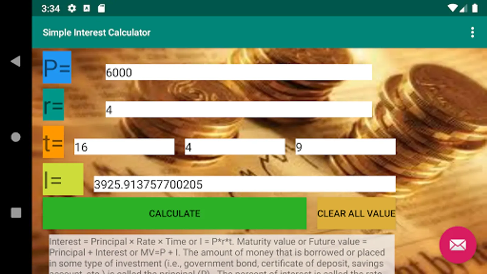 Simple interest (i) = principal (p) x rate in percent (r) x time (t).