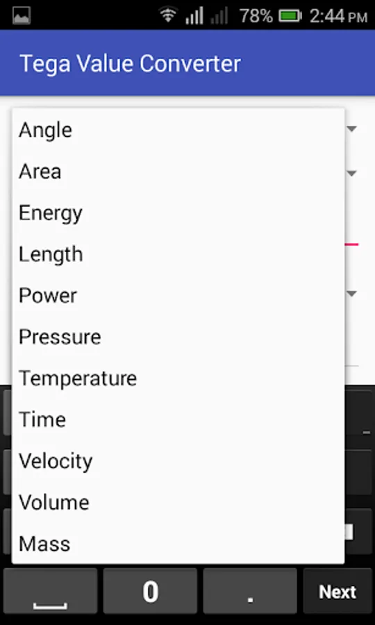 "Length"--> "Angstrom", "Centimeters", "Chain", "Fathom", "Feet", "Hand", "Inch", "Kilometers", "Link", "Meter","Microns", "Mile","Millimeter","Nanometers","Nautical Miles", "PICA", "Rods", "Span", "Yard"