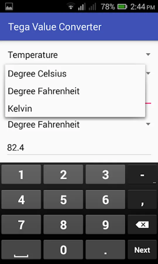 "Temperature"-->"Degree Celsius", "Degree Fahrenheit", "Kelvin"