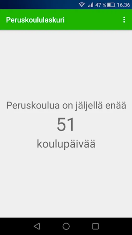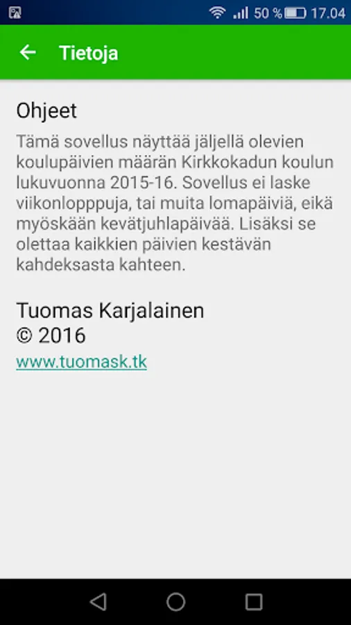 At present, the application calculates the days nurmes kind Kirkkokatu school model. In addition, it assumes each day lasting from eight to two.
