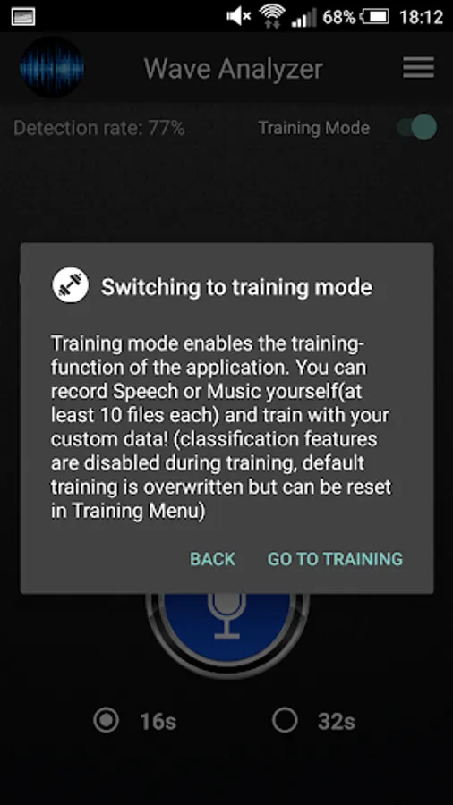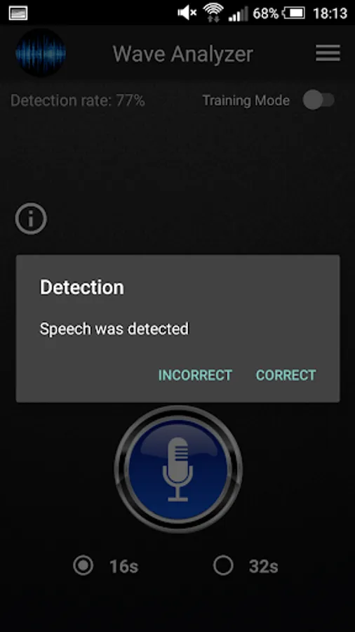 This app tries to analyze recorded sound to detect if it's speech or music using an LDA algorithm. It might not work properly in every environment and on every phone, so there is the possibility to record your own speech/music files and train the algorithm with them. Still in development.