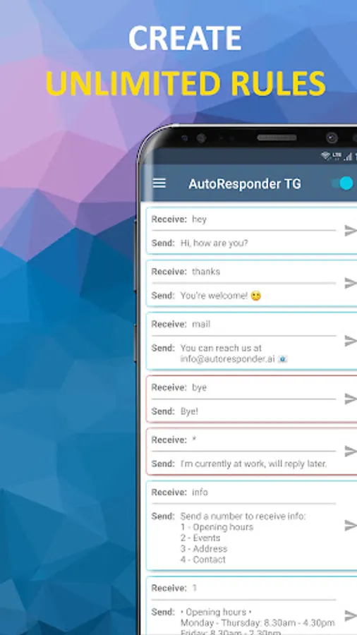 Automatically respond to custom received Telegram messages with this bot. You have a lot of settings to customize each auto reply for your needs. Download now for free!